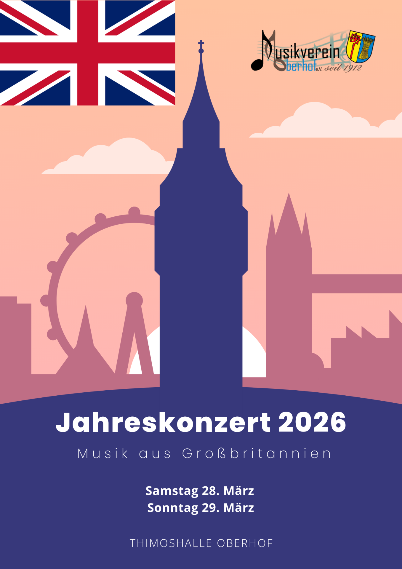 In diesem Jahr nehmen wir euch mit auf eine musikalische Reise über den Ärmelkanal. Unter dem Motto "Großbritannien" laden wir herzlich zum Jahreskonzert am 28. und 29. März ein.